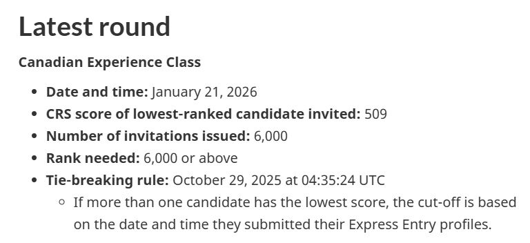 – Điểm CRS thấp nhất: 509 (giảm 2 điểm so với lần phát 8,000 thư mời cũng dành cho nhóm CEC cách đây 2 tuần vào ngày 07/01/2026)