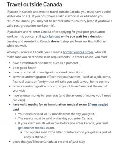 Có. Nếu bạn đang ở Canada và muốn ra nước ngoài, bạn phải có visa tạm trú (TRV) hoặc eTA còn hiệu lực để được quay lại Canada; nếu không có, bạn có thể bị từ chối nhập cảnh, kể cả khi đã có hoặc đang xin PGWP. Trong trường hợp bạn rời Canada và quay lại sau khi đã nộp hồ sơ PGWP, bạn vẫn được phép làm việc toàn thời gian trong thời gian chờ quyết định, và việc xuất cảnh. Việc nhập cảnh lại không làm gián đoạn quyền làm việc này. Khi nhập cảnh, bạn sẽ gặp nhân viên biên phòng và phải đáp ứng các điều kiện cơ bản như: có hộ chiếu/giấy tờ đi lại hợp lệ, sức khỏe tốt, không có tiền án hay vi phạm di trú, chứng minh có ràng buộc để quay về nước (công việc, nhà ở, tài chính, gia đình), chứng minh sẽ rời Canada khi kết thúc thời gian lưu trú, có đủ tài chính cho thời gian ở Canada, và có kết quả khám sức khỏe di trú còn hiệu lực (nếu được yêu cầu).